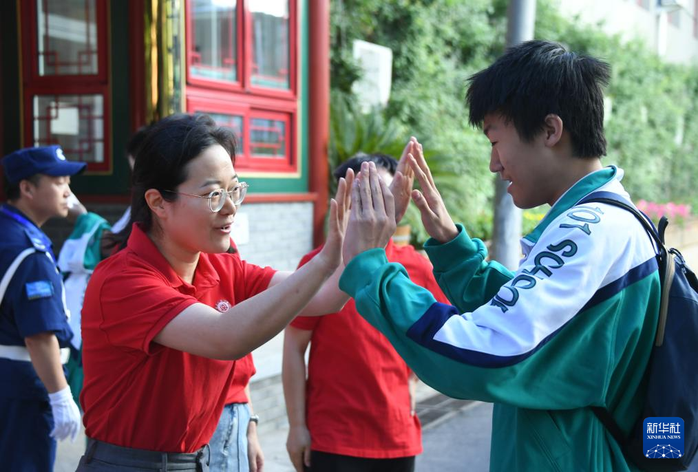 6月24日,在北京一零一中双榆树校区考点,考生进入考点前与老师击掌。