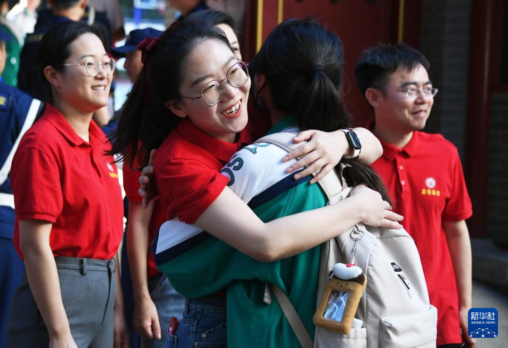 6月24日,在北京一零一中双榆树校区考点,老师与即将进入考点的考生拥抱。