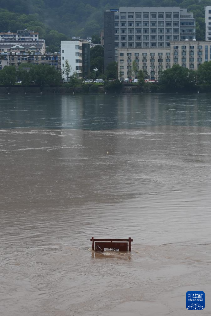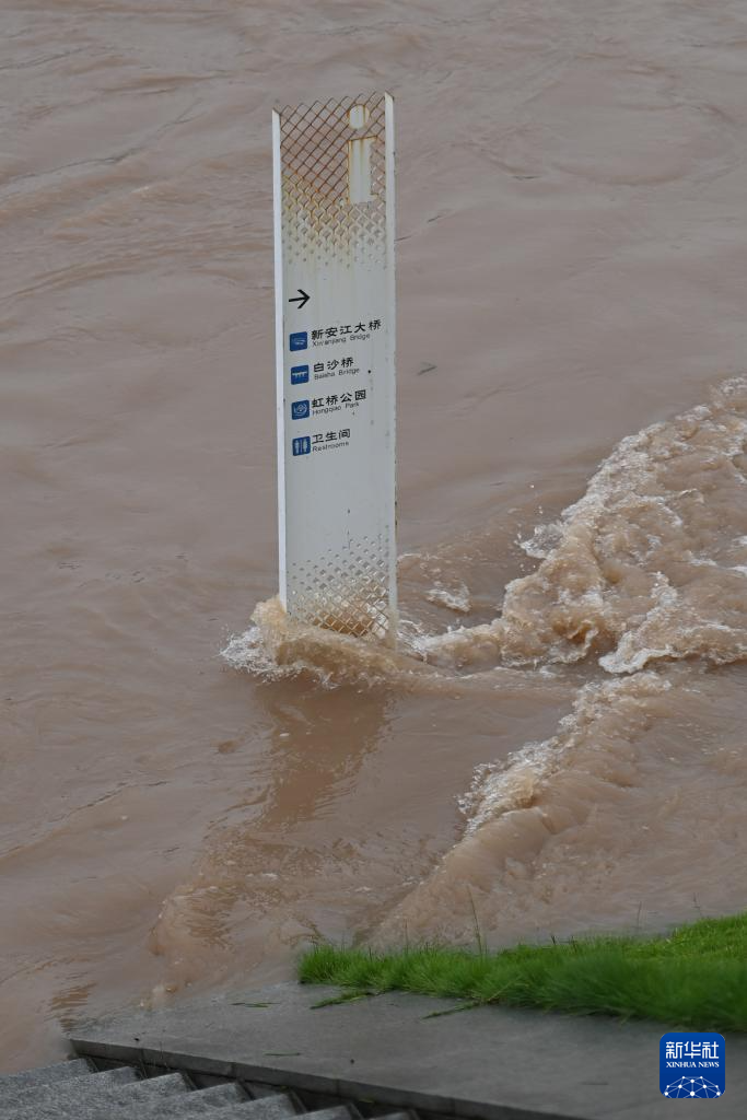 6月24日,位于浙江建德城区新安江畔绿道的一块标牌已被洪水部分淹没。