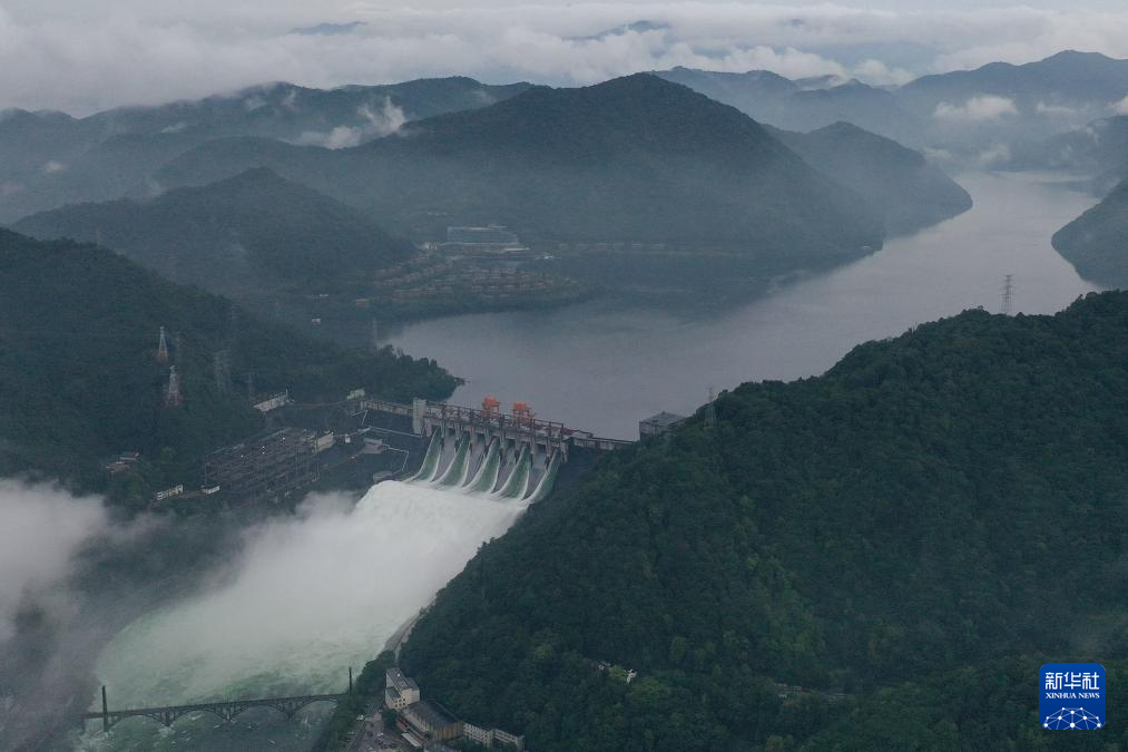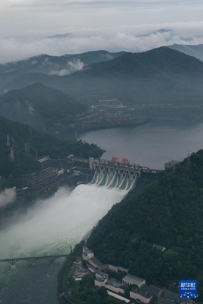 6月24日拍摄的开启5孔泄洪的新安江水库。