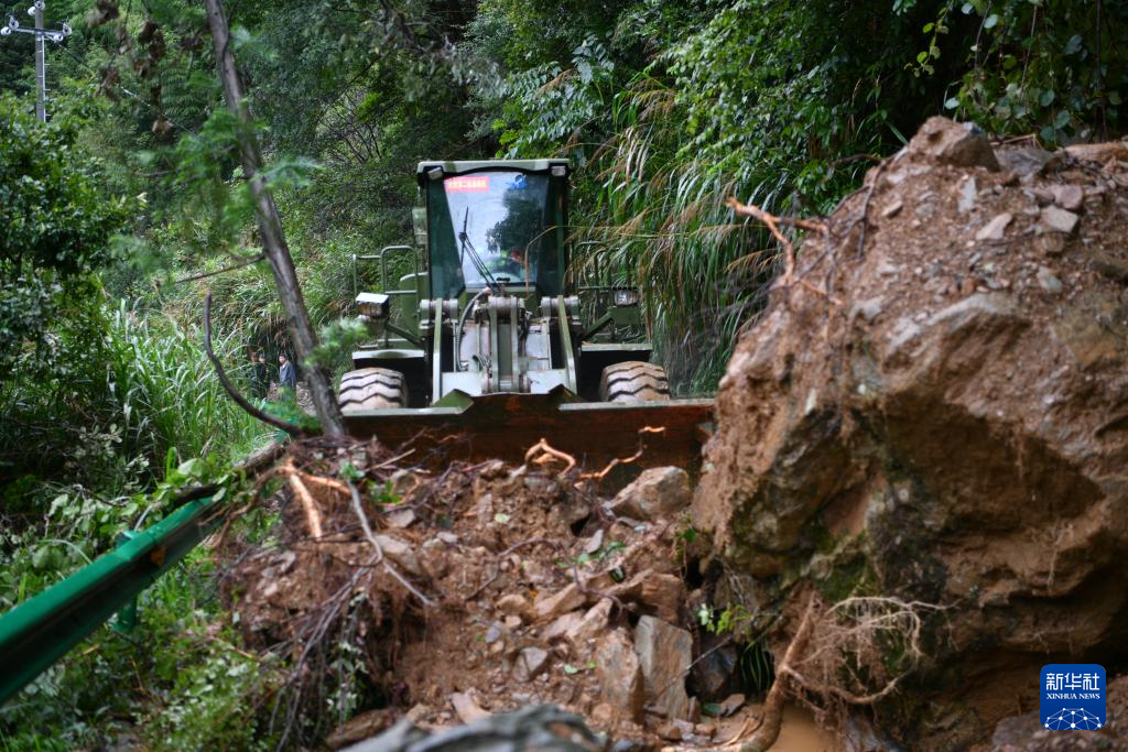 6月23日下午,在安徽省黄山市歙县绍濂乡,武警官兵驾驶重型机械清理前往古祝村道路上的淤泥和碎石。