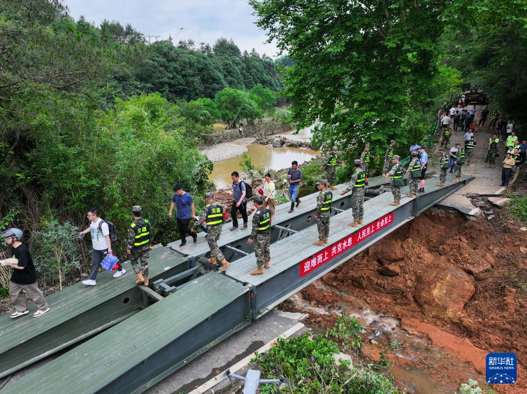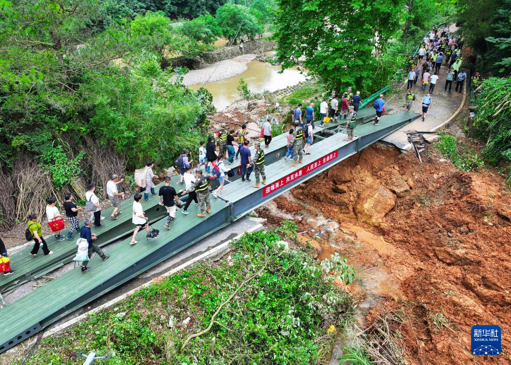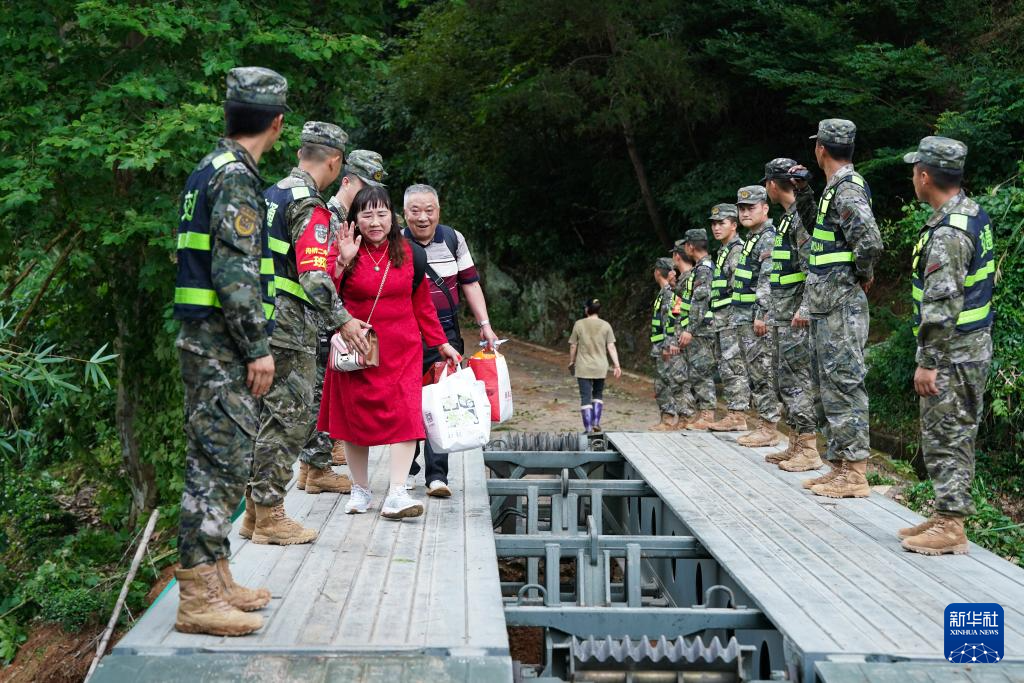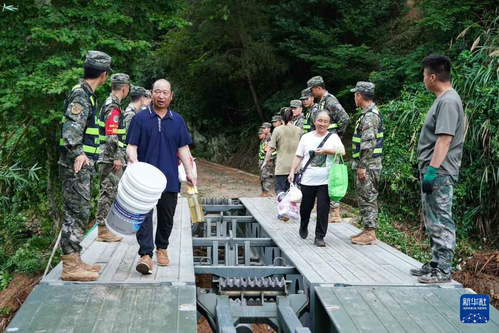 6月22日,在安徽省黄山市歙县绍濂乡小溪村,武警官兵架设的临时桥梁贯通,村民通过桥梁出行。