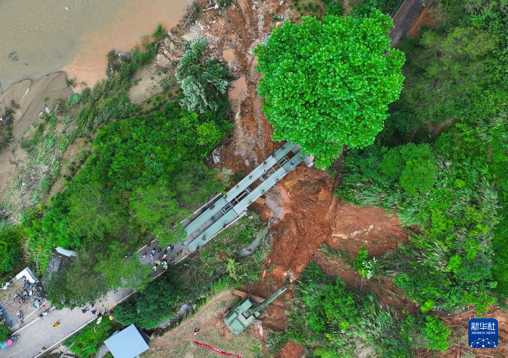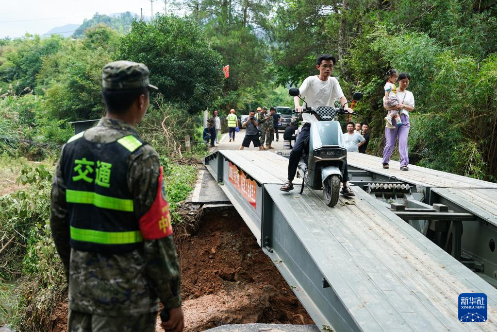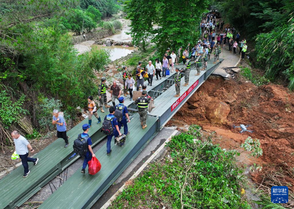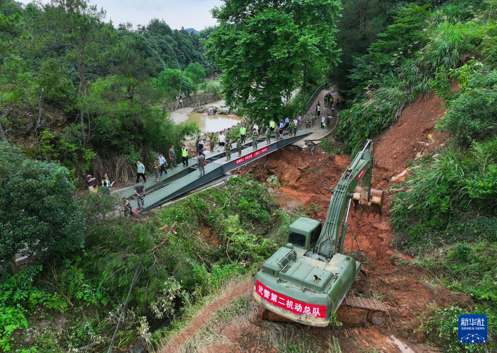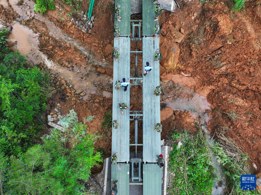 6月22日,在安徽省黄山市歙县绍濂乡小溪村,武警官兵架设的临时桥梁贯通,村民通过桥梁出行。