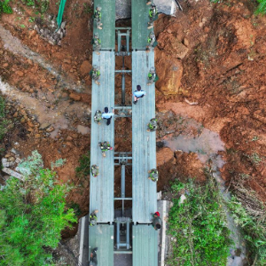 6月22日,在安徽省黄山市歙县绍濂乡小溪村,武警官兵架设的临时桥梁贯通(无人机照片)。