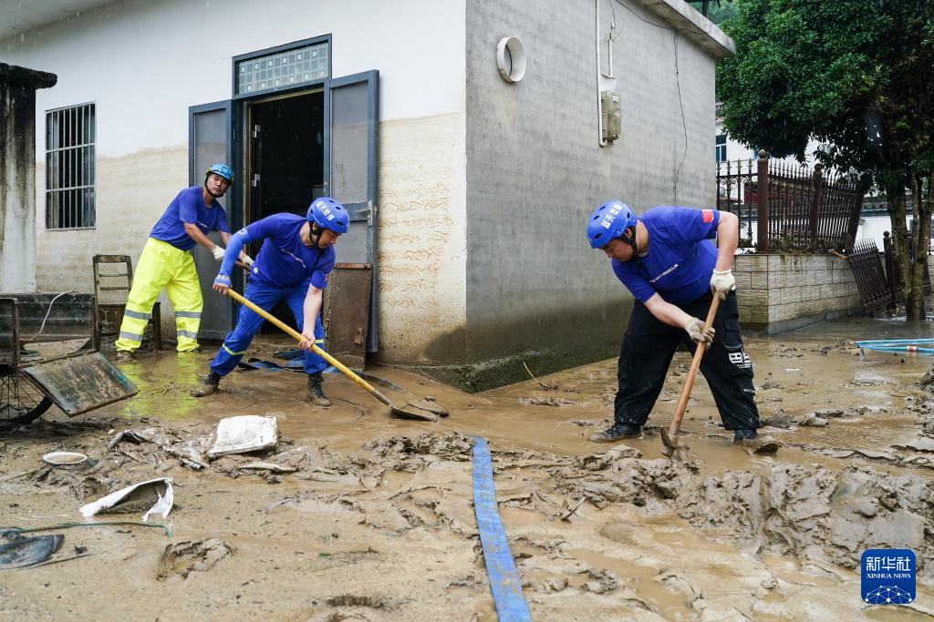 6月24日,在安徽省黄山市歙县绍濂乡绍濂村,救援人员为受灾居民家清淤。