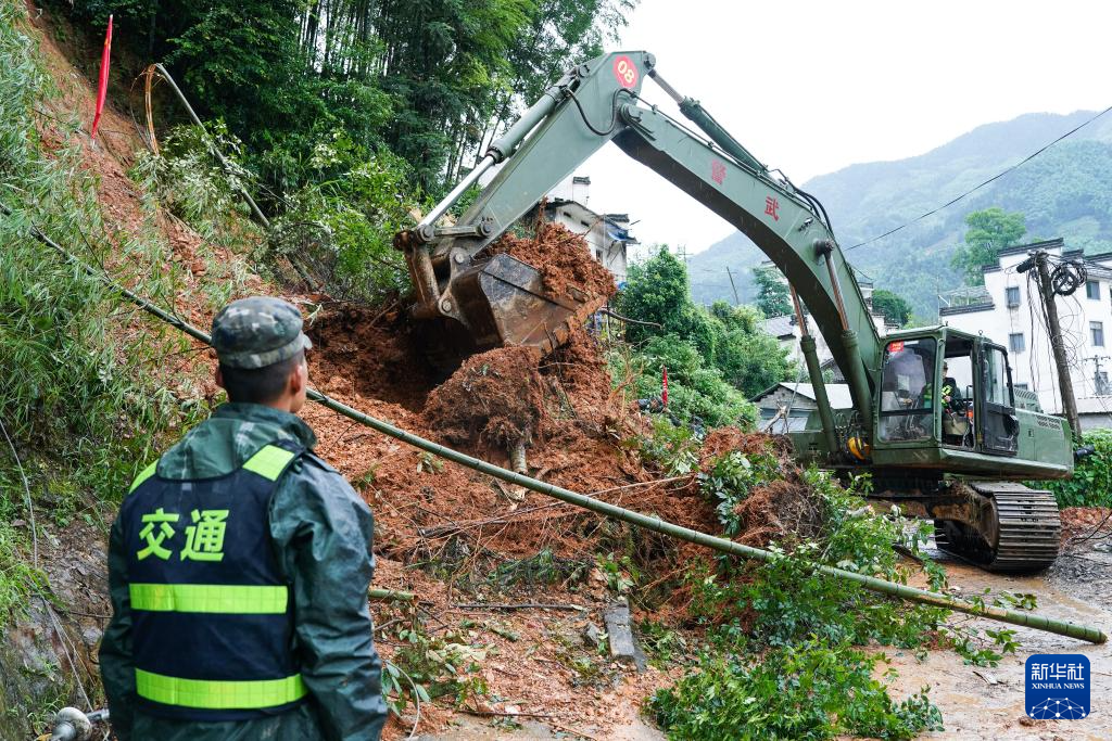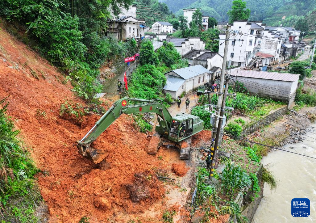 6月24日,在安徽省黄山市歙县绍濂乡清溪村,武警官兵驾驶挖掘机疏通道路。