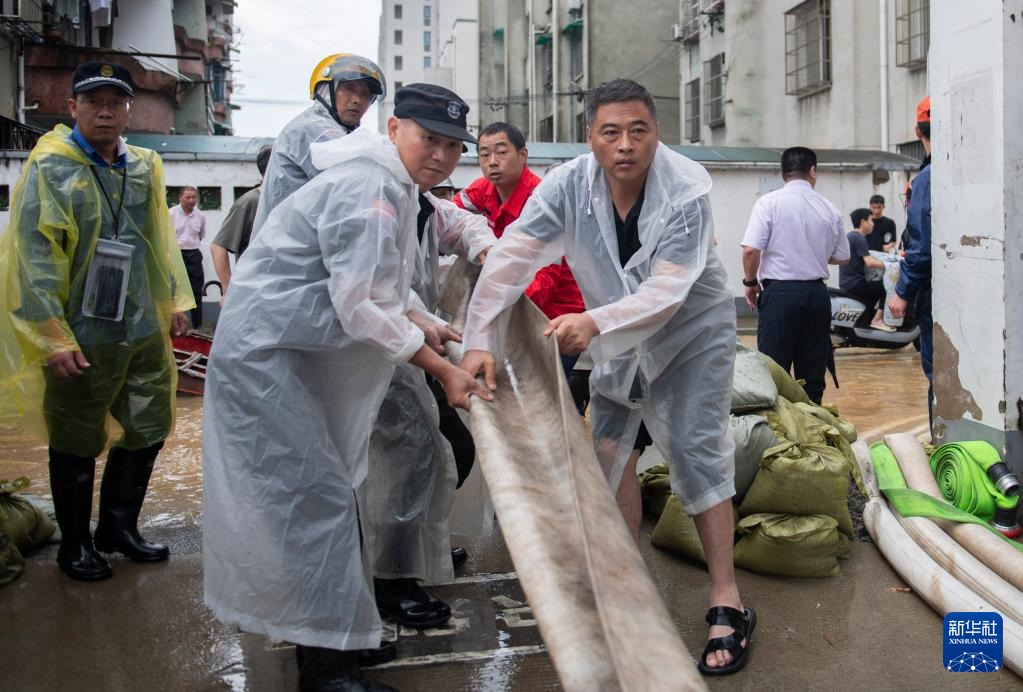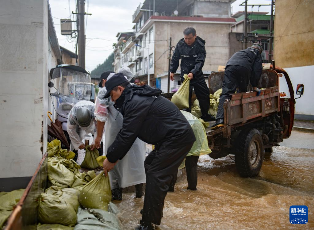 6月24日,抢险人员在安徽省黄山市屯溪区昱东街道水心亭社区放置沙袋。