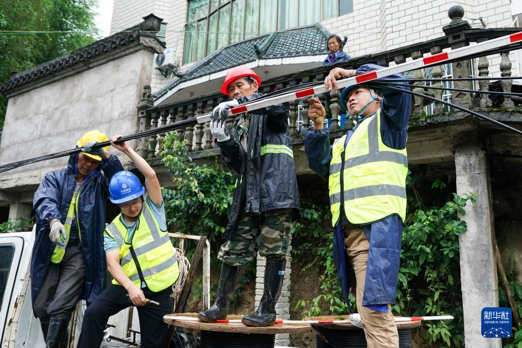 6月24日,在安徽省黄山市歙县王村镇升庄村宋坑组,安徽移动黄山分公司应急通信保障人员抢修损坏的通信光缆。
