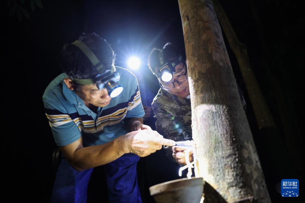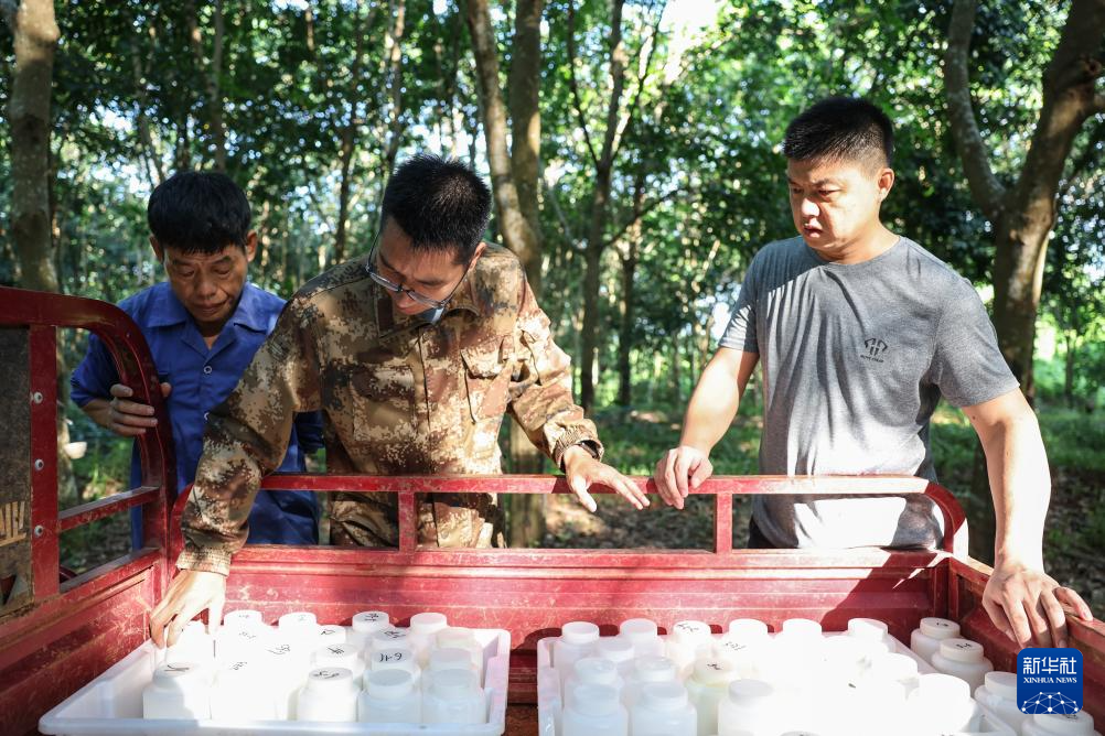 6月20日,在海南儋州的橡胶林里,中国热带农业科学院橡胶所的科研人员在收集胶乳。