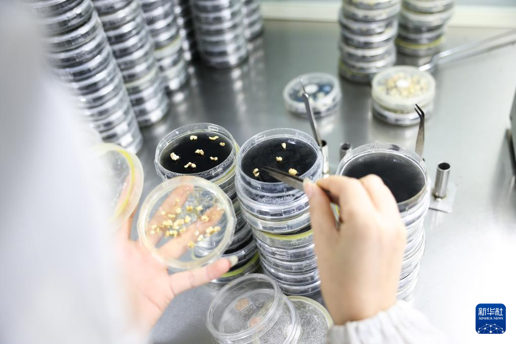 6月20日,在中国热带农业科学院儋州院区的生产车间,科研人员在更换培养基诱导橡胶树体细胞胚。
