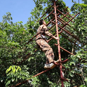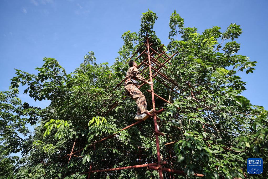 6月20日,在海南儋州的橡胶林里,中国热带农业科学院橡胶所副研究员张源源在攀爬脚架。