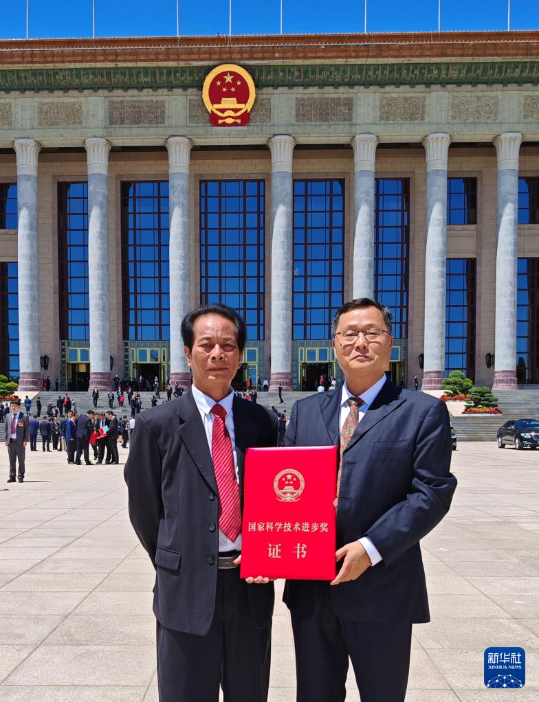6月24日,国家天然橡胶产业技术体系首席科学家黄华孙(左)和中国热带农业科学院橡胶所研究员李维国手持获奖证书在人民大会堂外合影留念。