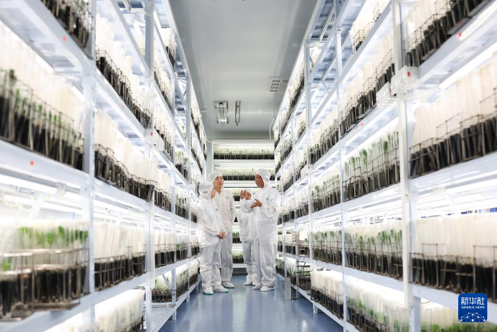 6月20日,中国热带农业科学院橡胶树育种团队的科研人员在海南儋州院区的培养室里观察橡胶树试管苗。