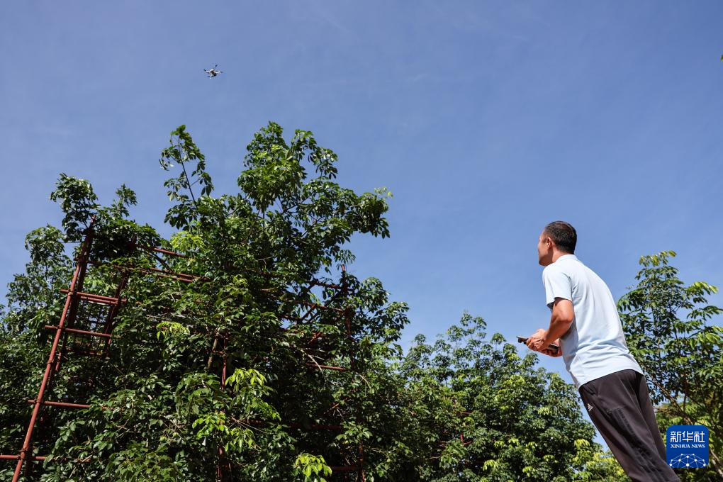 6月20日,在海南儋州的橡胶林里,中国热带农业科学院橡胶所副研究员王祥军在用无人机观察橡胶树株型。