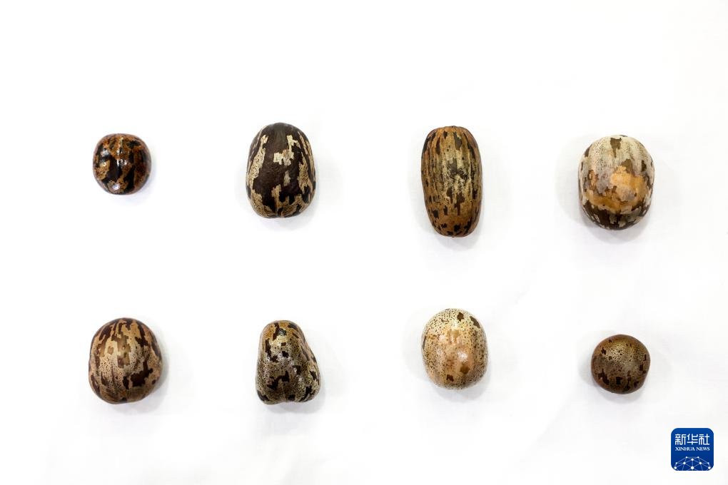 这是6月20日在中国热带农业科学院儋州院区拍摄的不同品种的橡胶树种子。