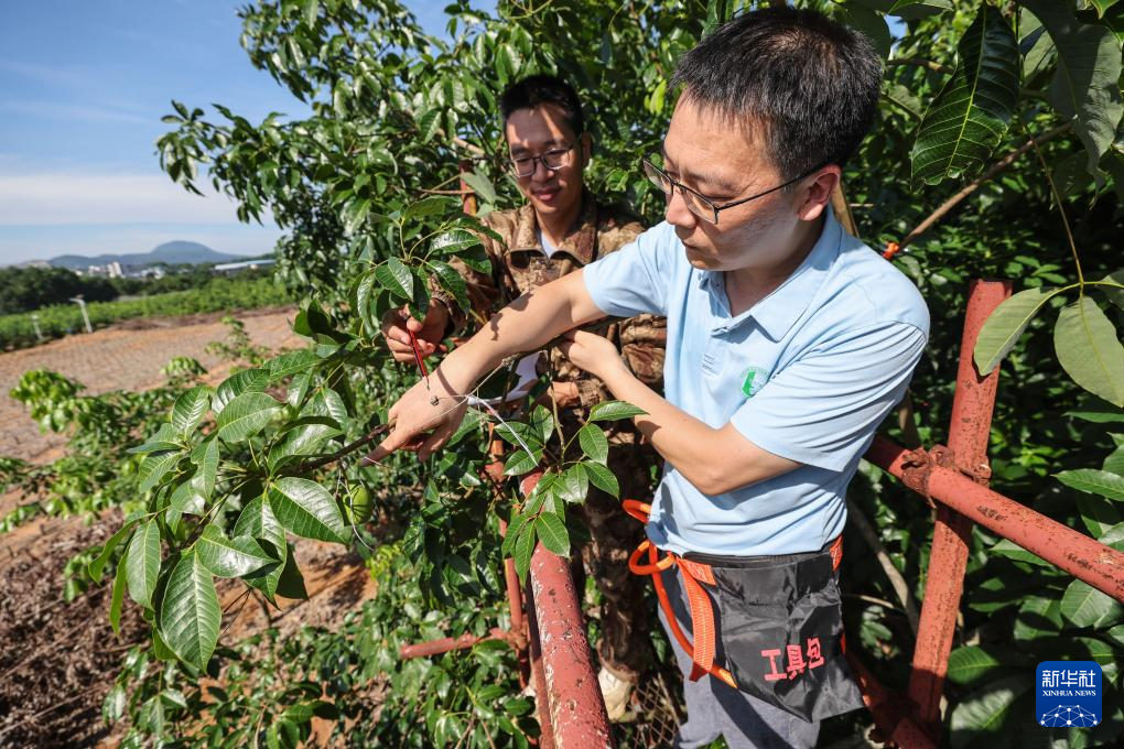 6月20日,在海南儋州的一棵橡胶树上,中国热带农业科学院橡胶所研究员高新生和副研究员张源源(左)在调查坐果率。