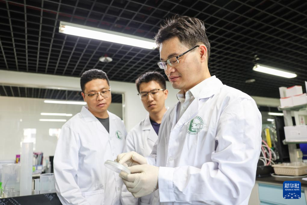 6月21日,在中国热带农业科学院海口院区实验室内,橡胶树育种团队的科研人员在观察、讨论实验内容。
