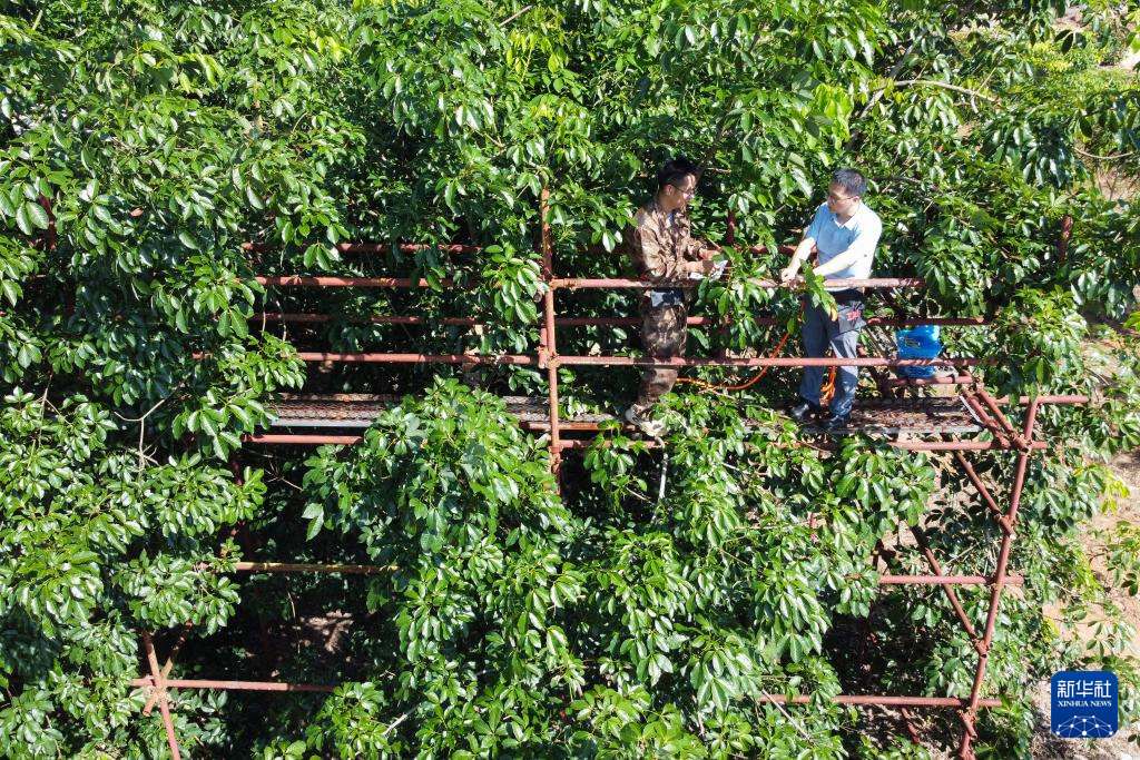 6月20日,在海南儋州的一棵橡胶树上,中国热带农业科学院橡胶所副研究员张源源(左)和研究员高新生在调查坐果率(无人机照片)。
