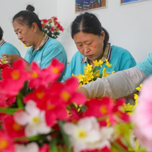 6月25日,在怀安县第六屯乡“妇女之家”,妇女们在加工制作手工花。