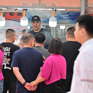 6月24日,人们在烧烤摊前等待美食出炉。