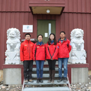 6月23日,在挪威新奥勒松,科考队员胡正毅、赵红颖、武小涵、许浩(从左至右)在中国北极黄河站前合影。