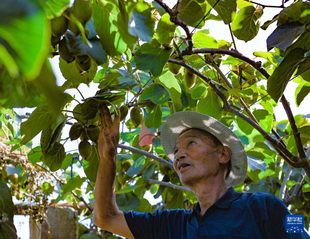 6月24日,在陕西省眉县横渠镇一处猕猴桃种植基地,农户在查看猕猴桃长势。