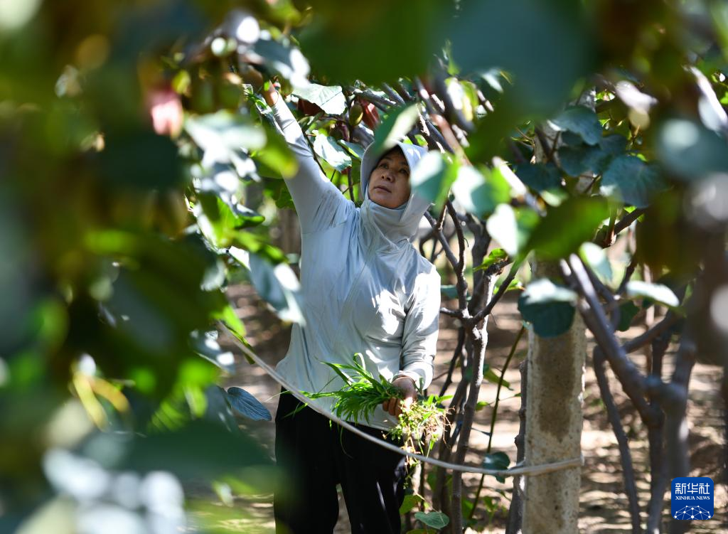 6月24日,在陕西省眉县横渠镇一处猕猴桃种植基地,农户用杂草覆盖猕猴桃果实,避免果实因夏季强日照引起日灼病。