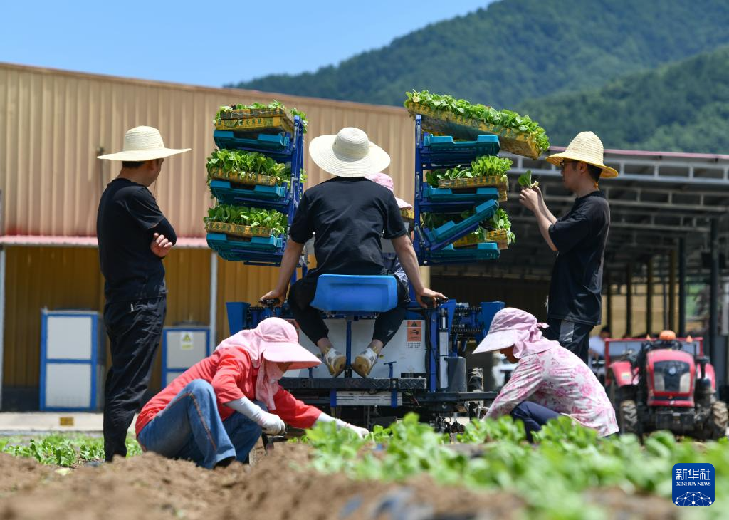 6月24日,在陕西省太白县咀头镇一处高山蔬菜田里,农户在栽种蔬菜苗。