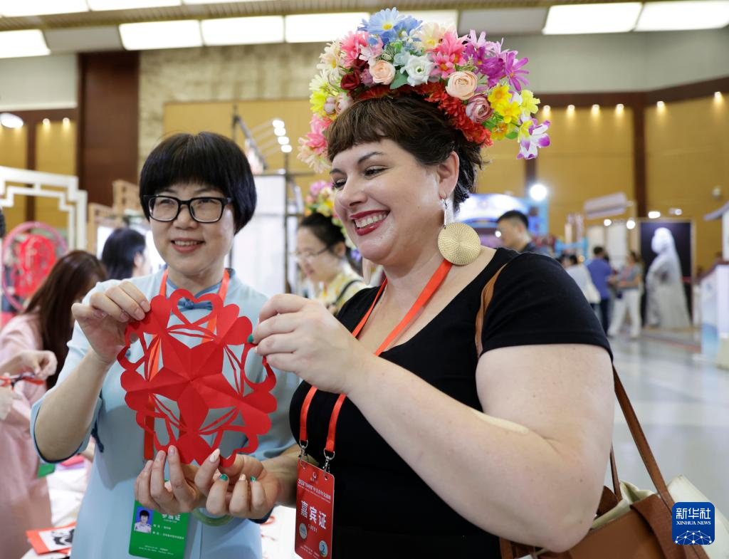 6月26日,嘉宾(右)在非遗展演暨青年集市上展示自己的剪纸作品。