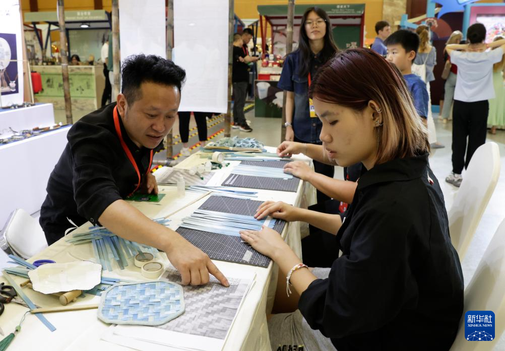 6月26日,嘉宾在非遗展演暨青年集市上体验武夷竹编。