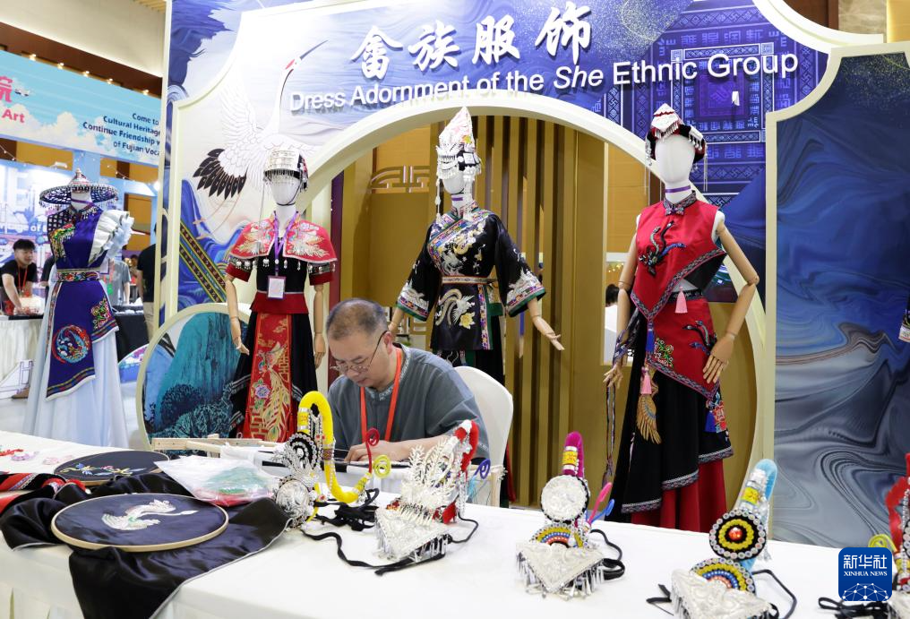 6月26日,民间艺人在非遗展演暨青年集市上制作畲族服饰。