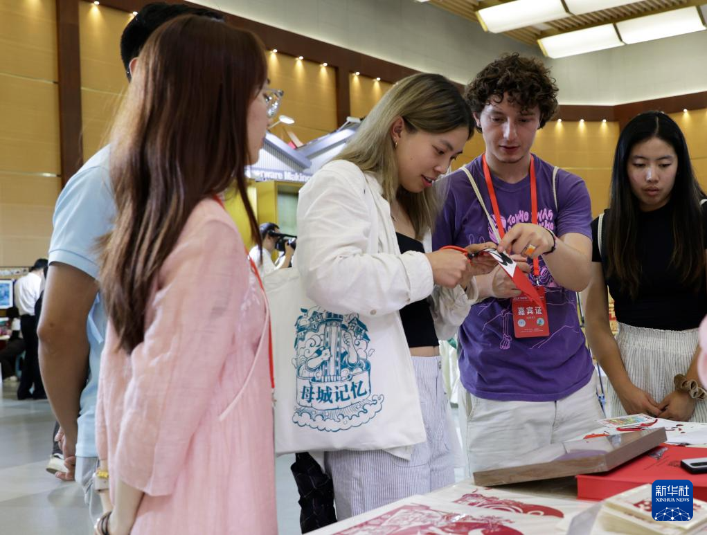 6月26日,嘉宾在非遗展演暨青年集市上体验剪纸。