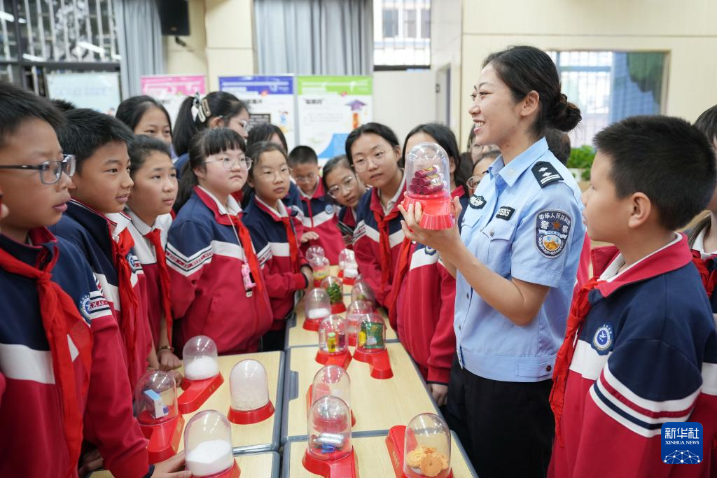 6月26日,在云南省昆明市海源小学,民警为学生讲解禁毒知识。