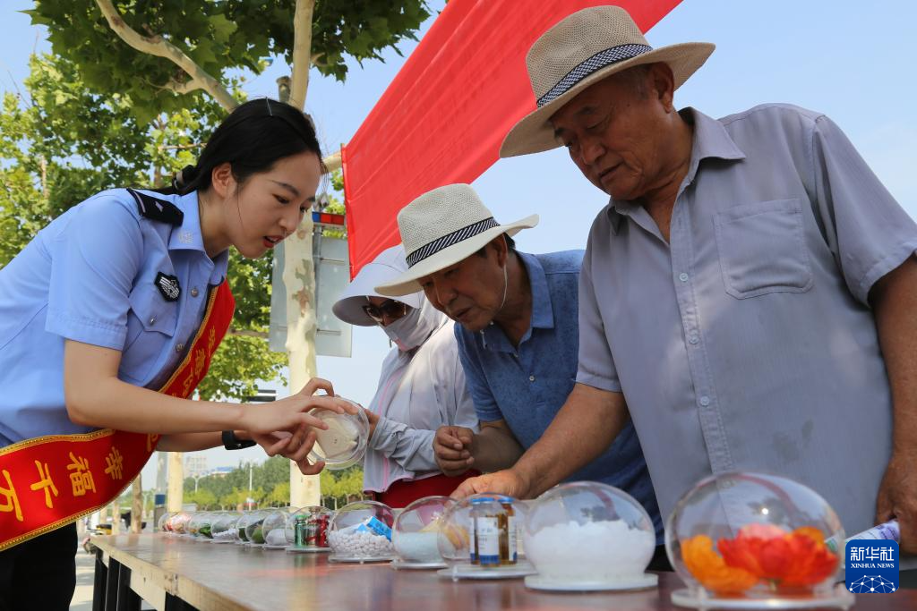 6月26日,山东省滨州市公安局沾化分局富国派出所民警向群众展示仿真毒品样本。
