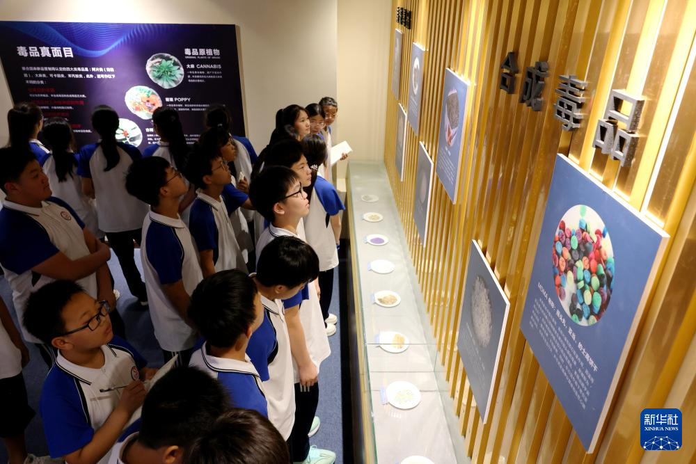 6月26日,中学生在山东省枣庄市市中区禁毒预防教育展馆了解毒品的危害。