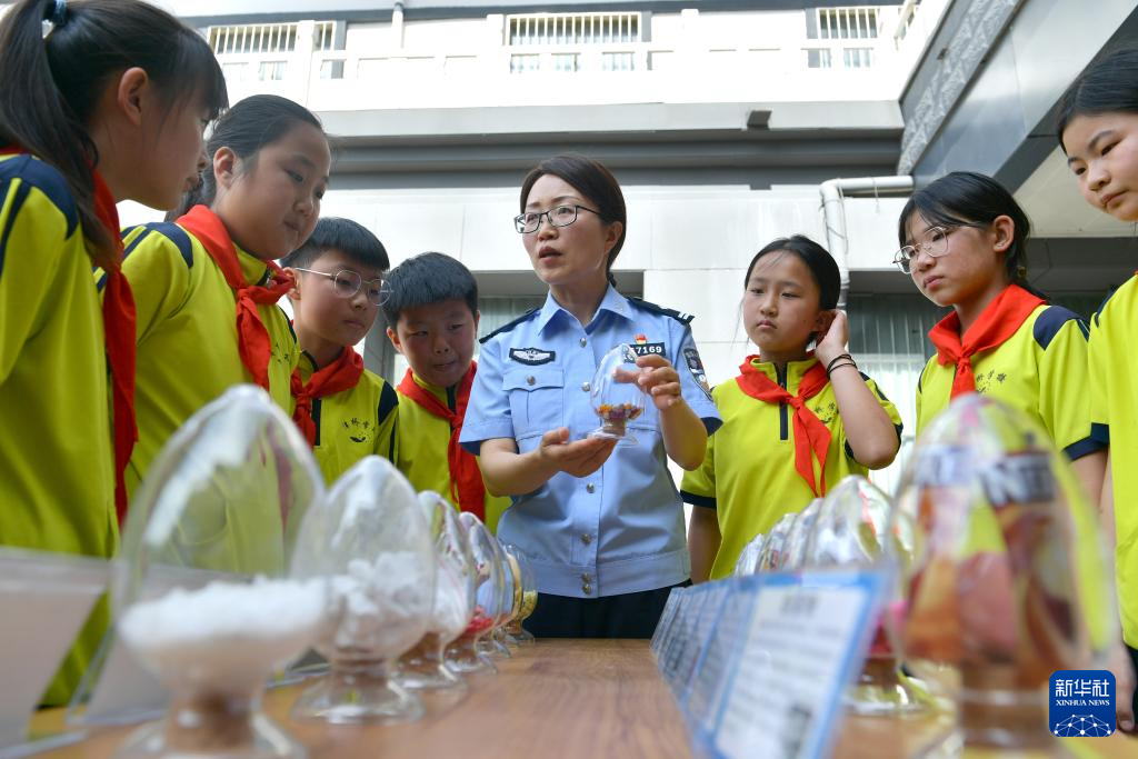 6月26日,在河南省夏邑县禁毒教育基地,民警通过仿真毒品模型给津桥学校学生普及识别毒品知识。