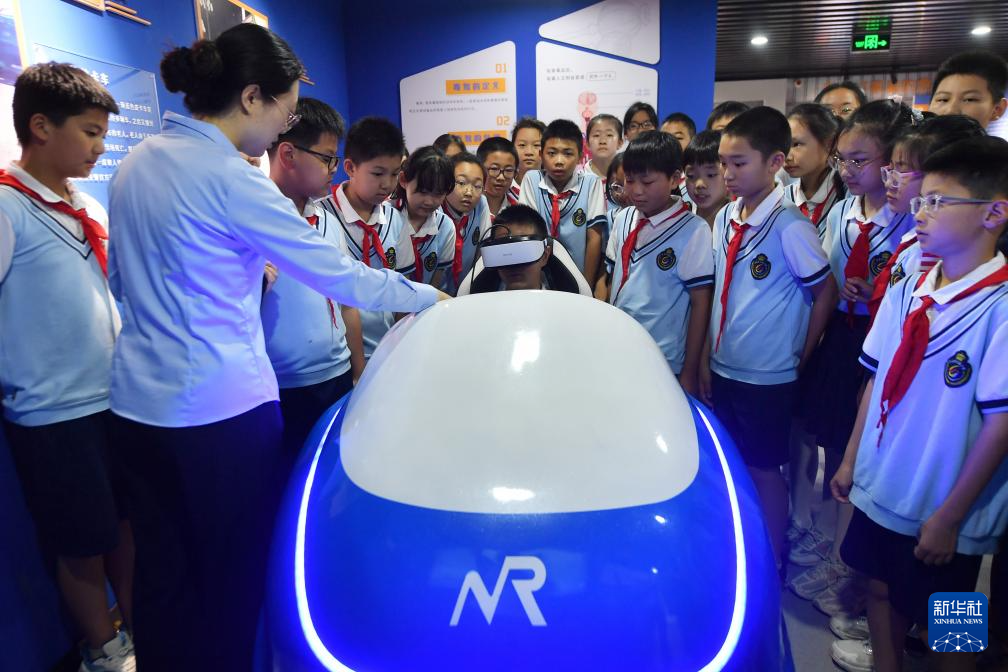 6月26日,在山东省青岛市禁毒教育基地,寿光路小学的学生进行VR毒驾体验。