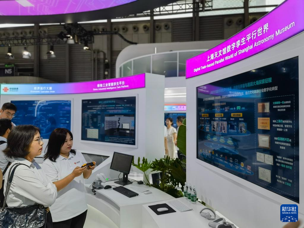 6月26日,观众在中国联通展台体验“上海天文馆数字孪生平行世界”。