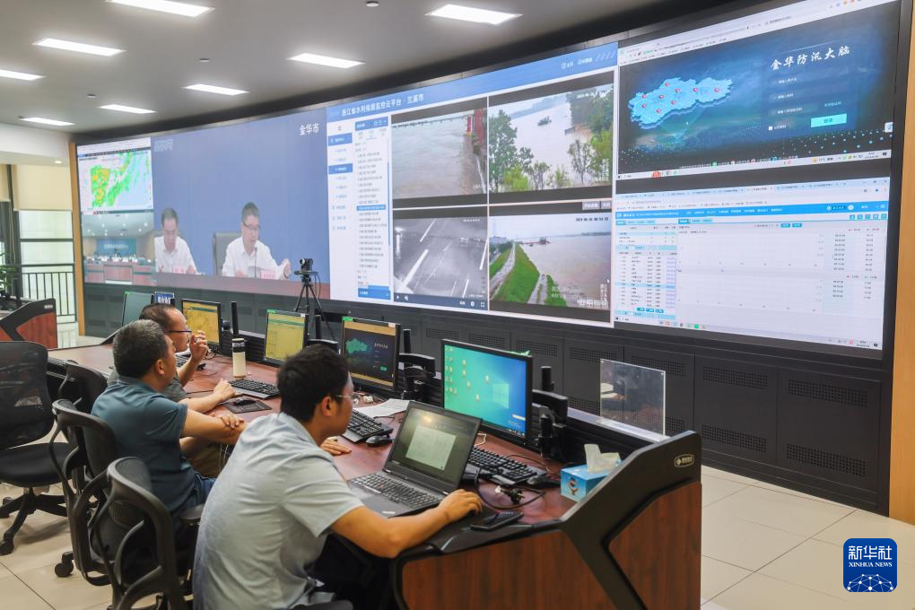 6月26日,在浙江省金华市兰溪市应急指挥中心,各部门工作人员开会研究汛情。