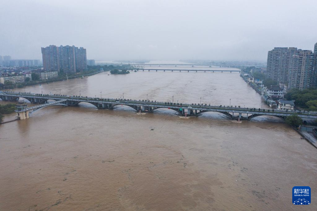 6月26日,浙江省金华兰溪市兰江的水位已高于城区路面(无人机照片)。