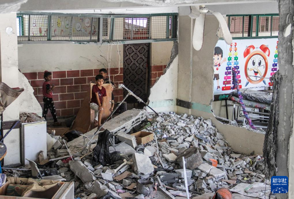 6月25日,巴勒斯坦儿童查看加沙城西部沙提难民营一所以军轰炸的学校。