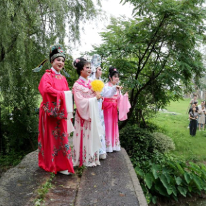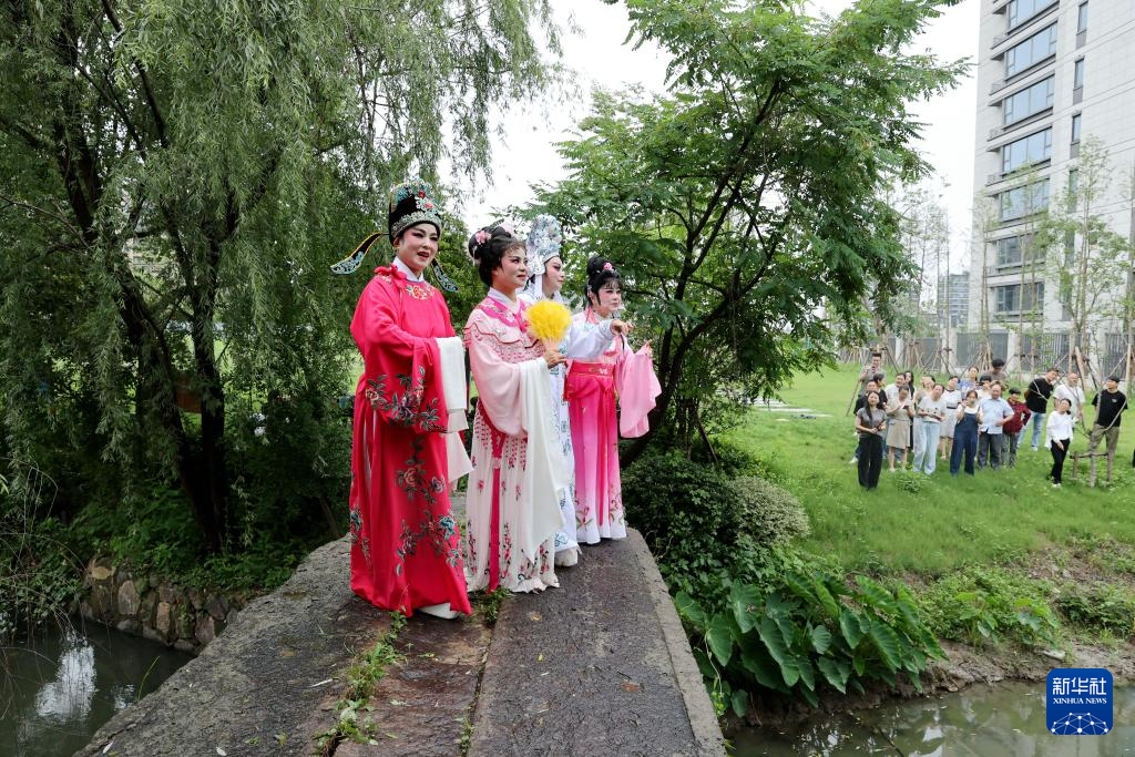 6月24日,在德清县雷甸镇雷甸村,演员在青云桥上为村民表演戏曲节目。