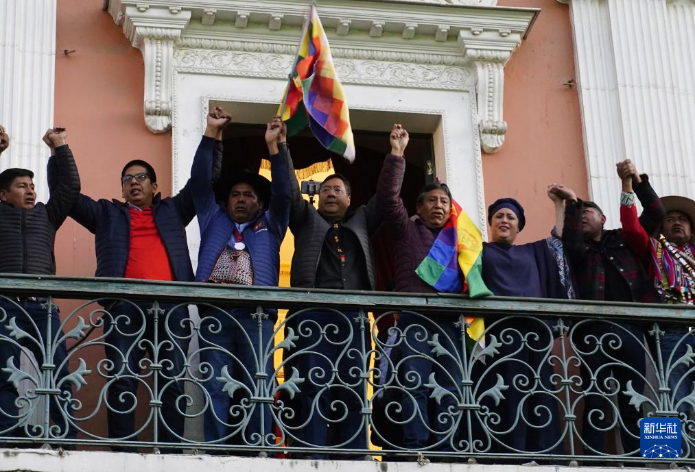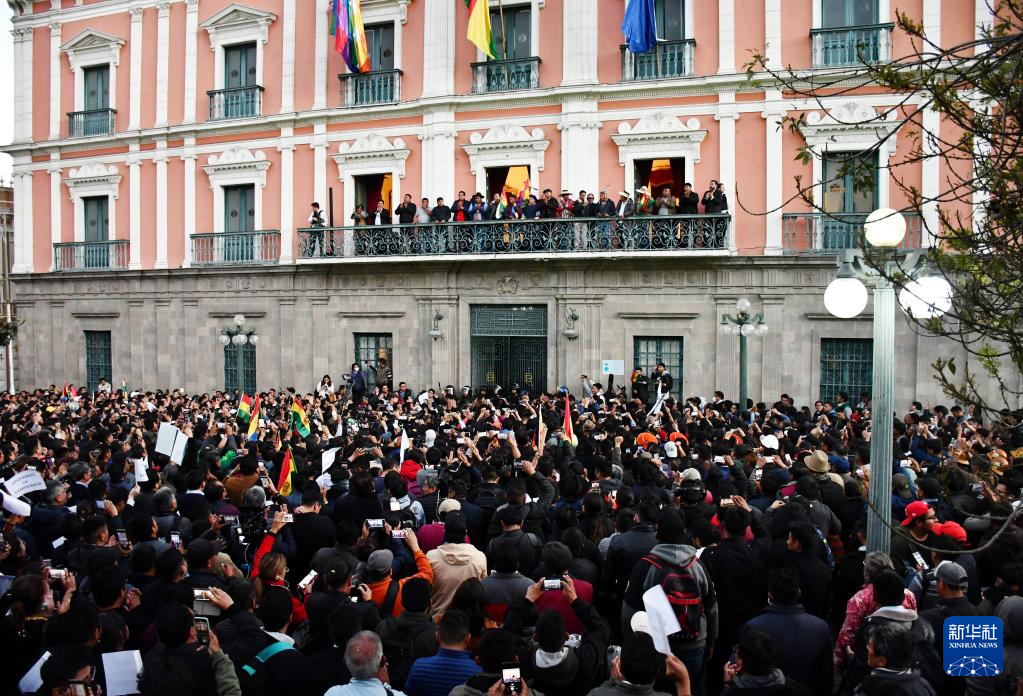 6月26日,在玻利维亚拉巴斯,玻利维亚总统阿尔塞(左四)向民众致意。