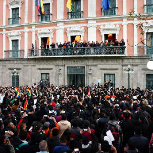6月26日,在玻利维亚拉巴斯,玻利维亚总统阿尔塞(中)向民众发表讲话。