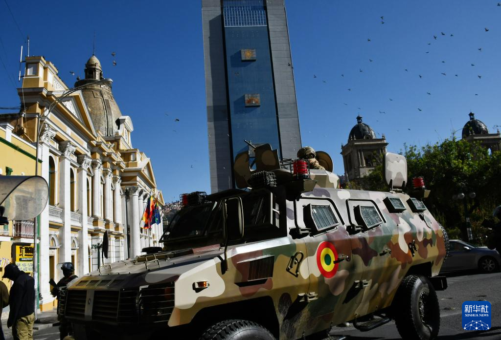 6月26日,在玻利维亚拉巴斯,军用车辆停在总统府附近的街道上。