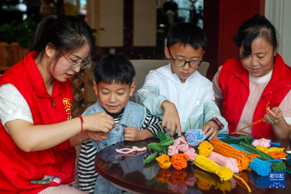 6月27日,在黄山市徽州区岩寺镇翰山村安置点,志愿者和孩子们一起做手工。