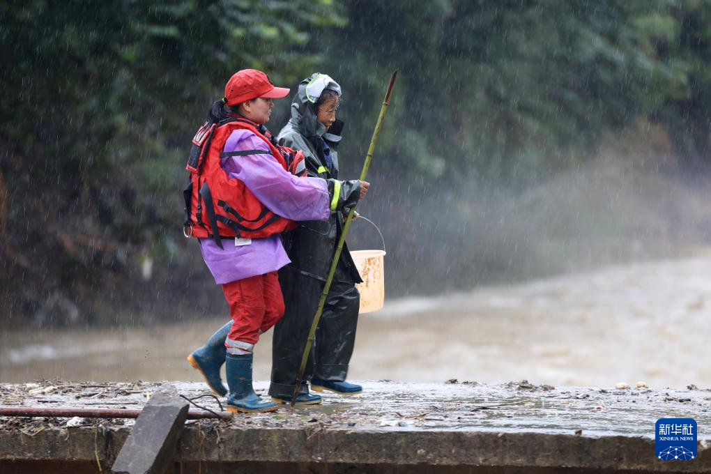 6月26日,山越救援队队员程红梅(左)在黄山市歙县绍濂乡和平村帮助村民过桥。