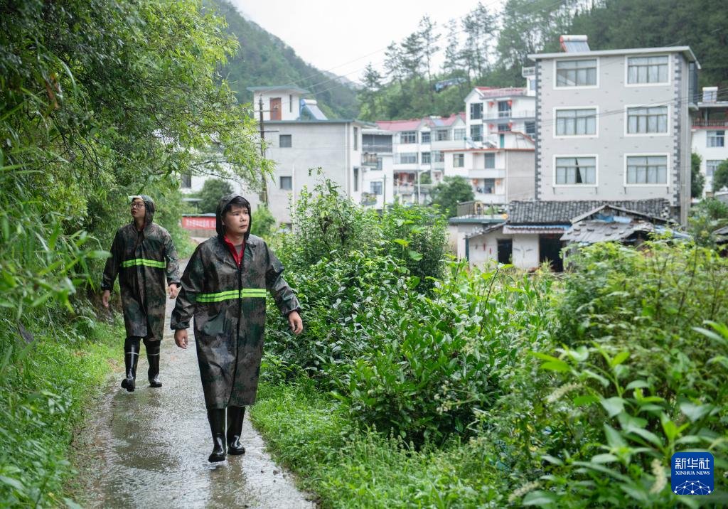 6月26日,在黄山市屯溪区阳湖镇黄口社区,社区干部毕志辉(前)和同事巡逻查看社区内涝情况。