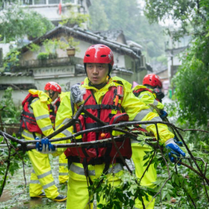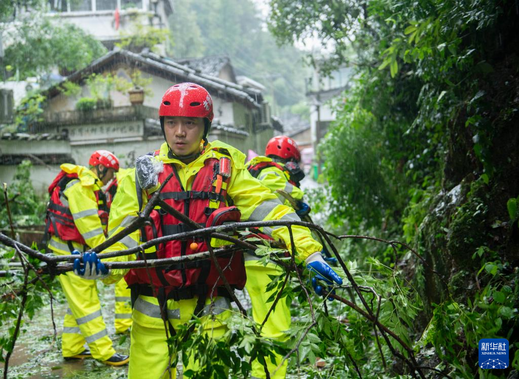 6月26日,在黄山市屯溪区老街街道,老街专职消防队队长程顺富(前)与队友们清理路面树枝。