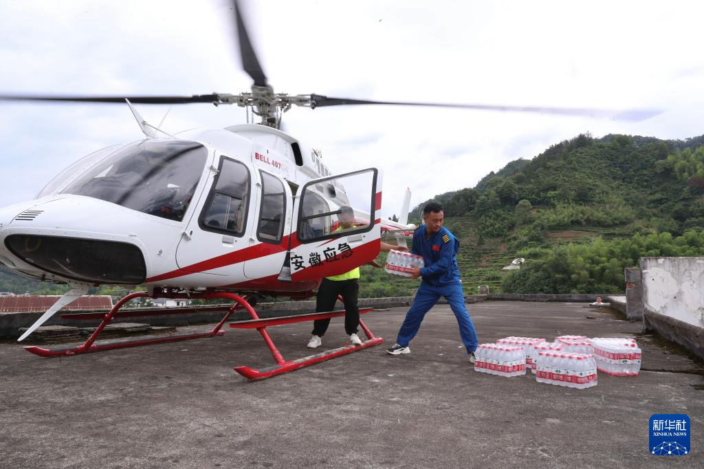 6月22日,救援人员从停靠在黄山市歙县绍濂乡小溪中心小学楼顶的救援直升机上取下物资。